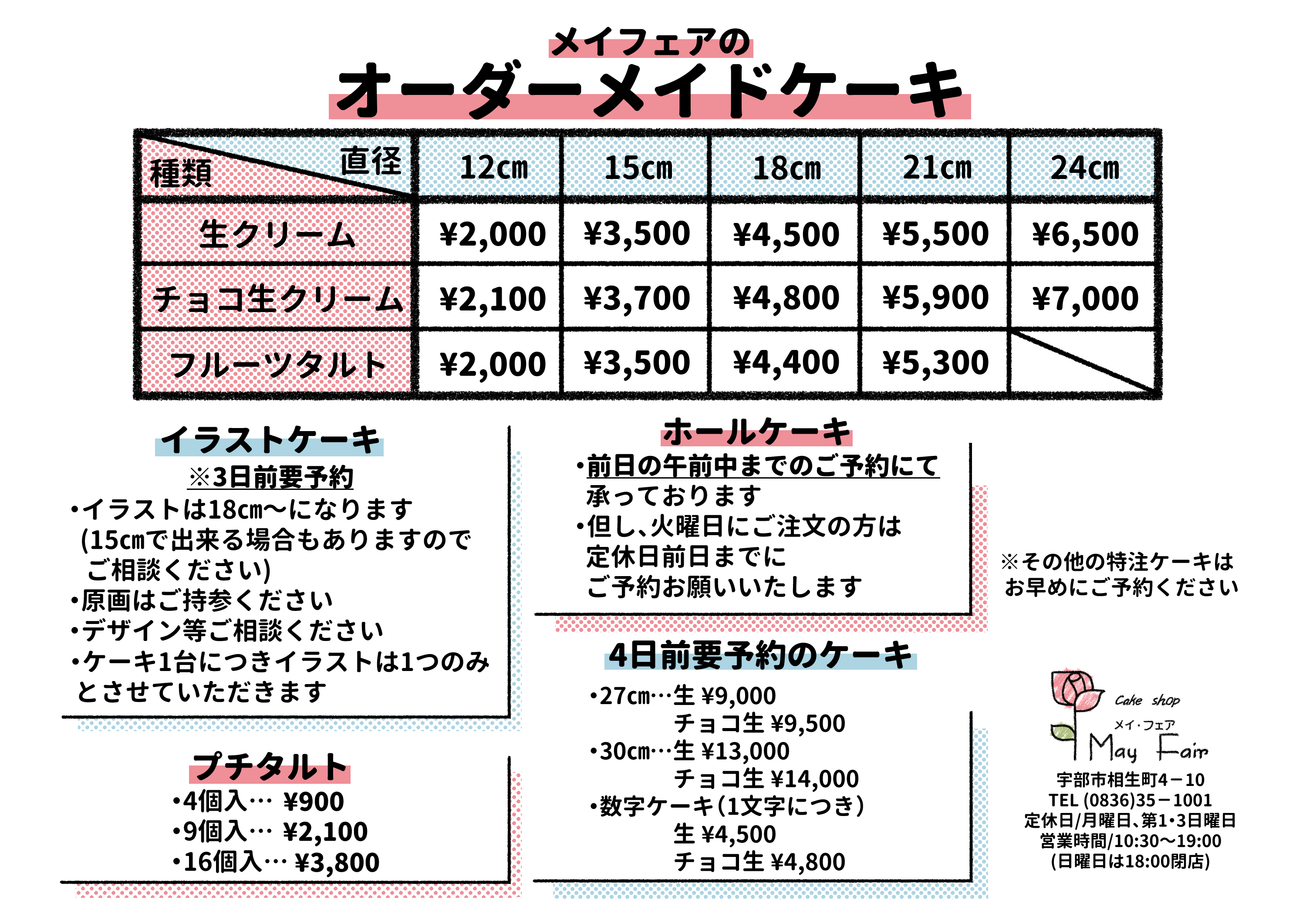 *18cm以上の生クリームorチョコ生クリームでお造りいたします(15cmで出来るものもございます)。