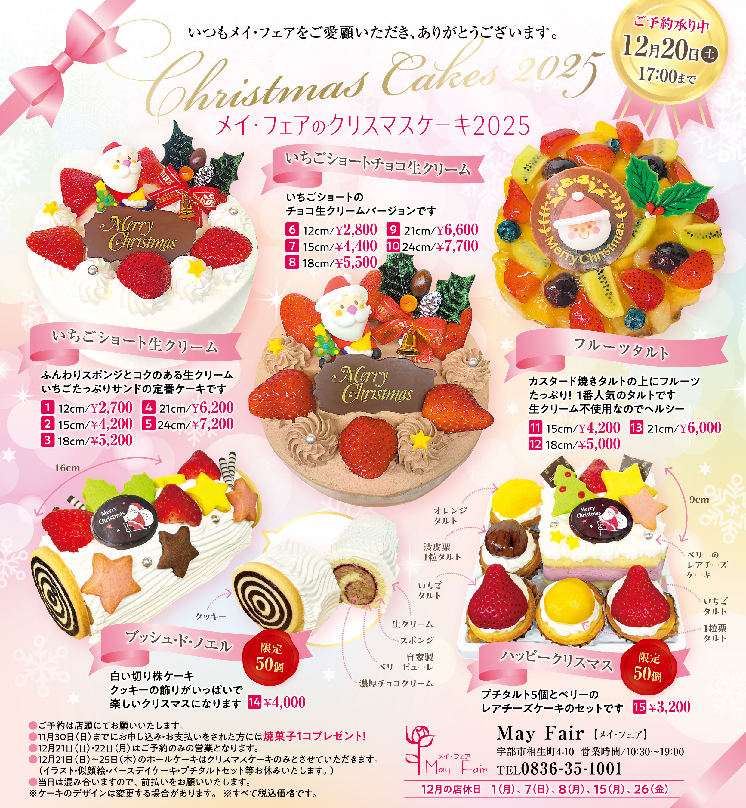 12月21日~25日はキャラクターケーキ等の特注ケーキはお休みさせて頂きます。